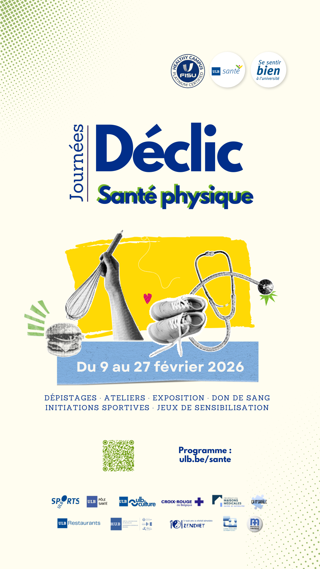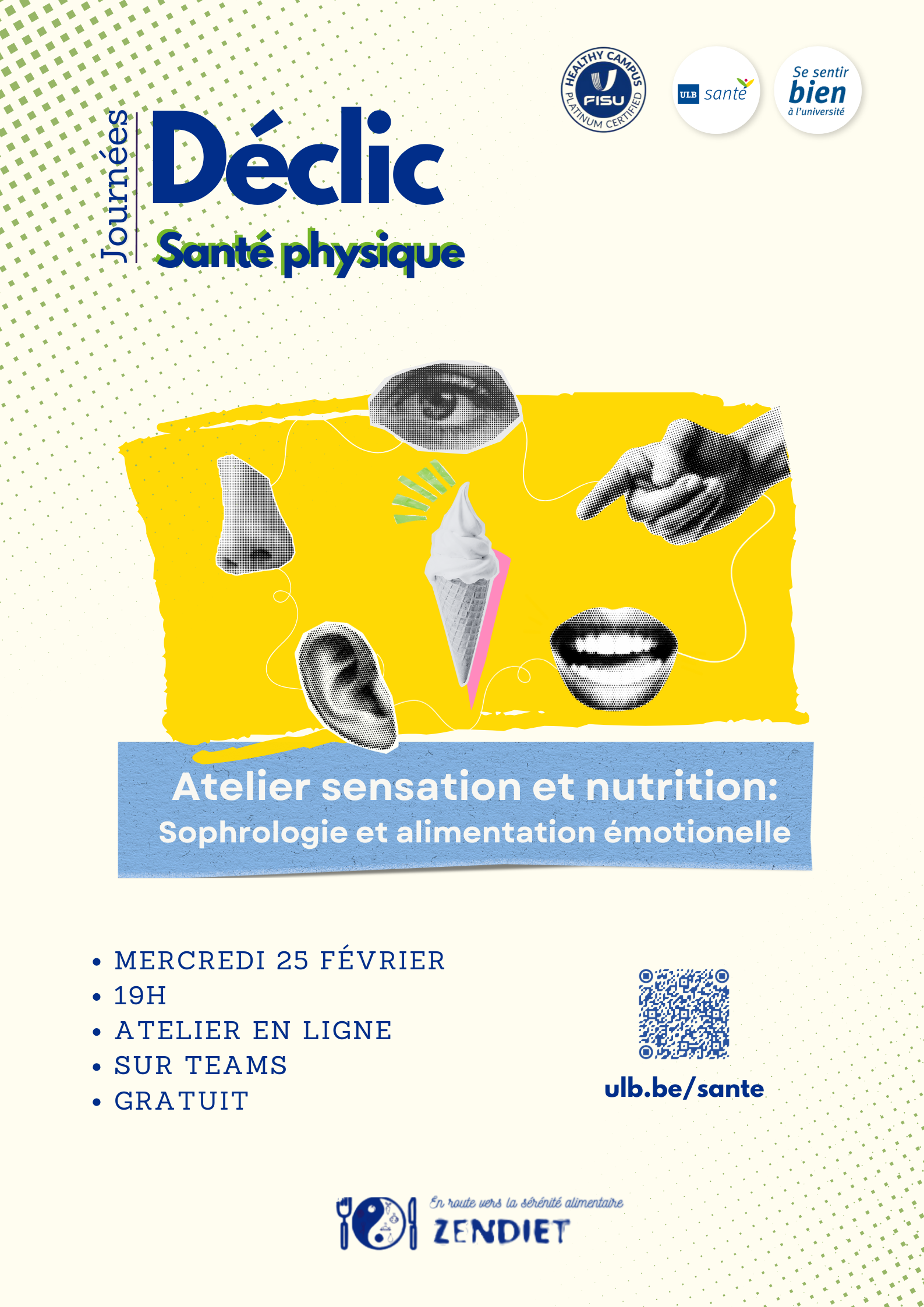 Dans le cadre de la 2ème édition de la campagne "Déclic Santé Physique", ULB Santé et Zen Diet vous proposent le 25 février en soirée un atelier sur l'alimentation, les sensations et les émotions !
