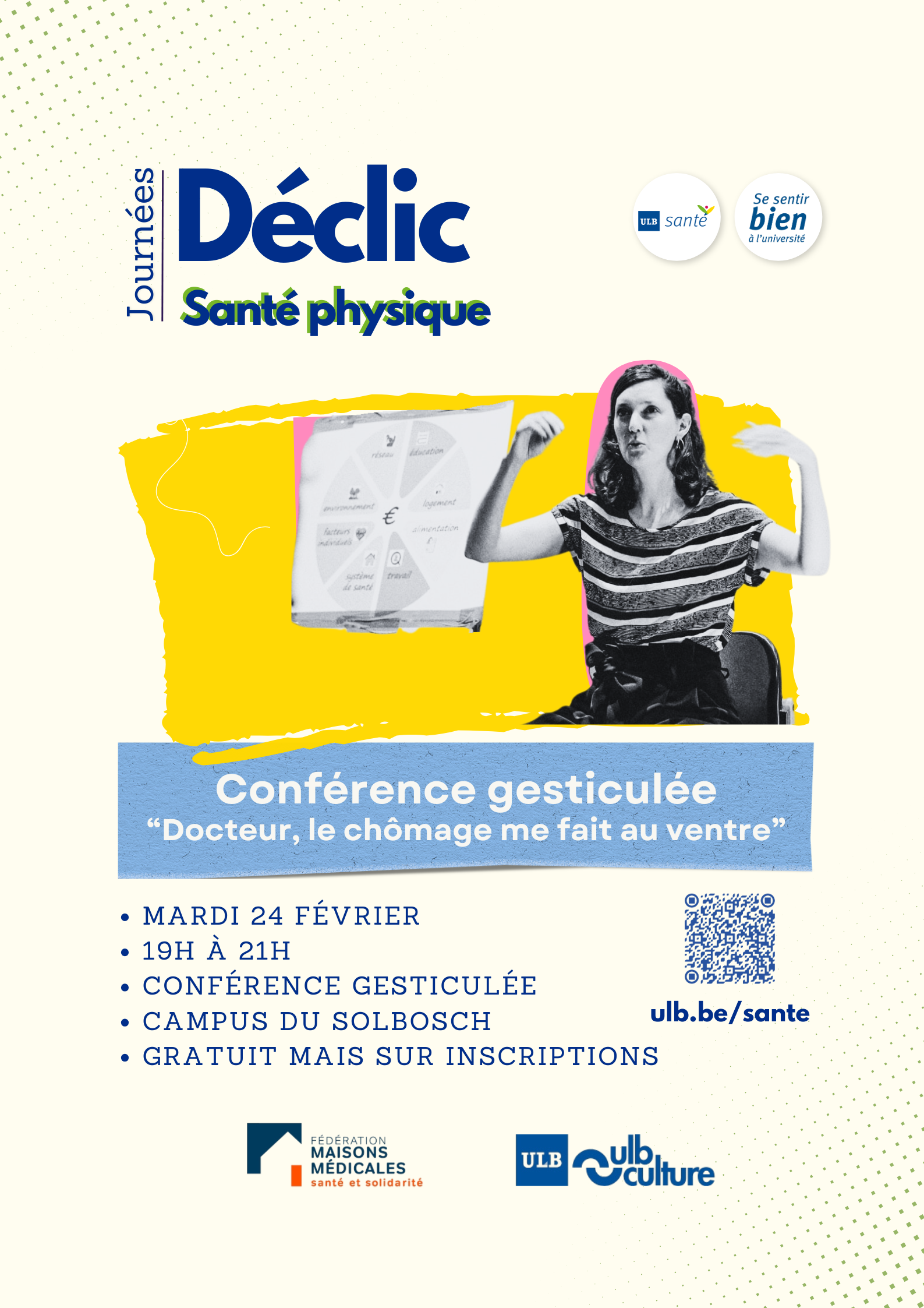 Dans le cadre de la 2ème édition de la campagne "Déclic Santé Physique", ULB Santé, ULB Culture et la Fédération des Maisons Médicales s'associent pour vous inviter à la conférence gesticulée du Dr. Hélène Dispas « Docteur, le chômage me fait mal au ventre ! »