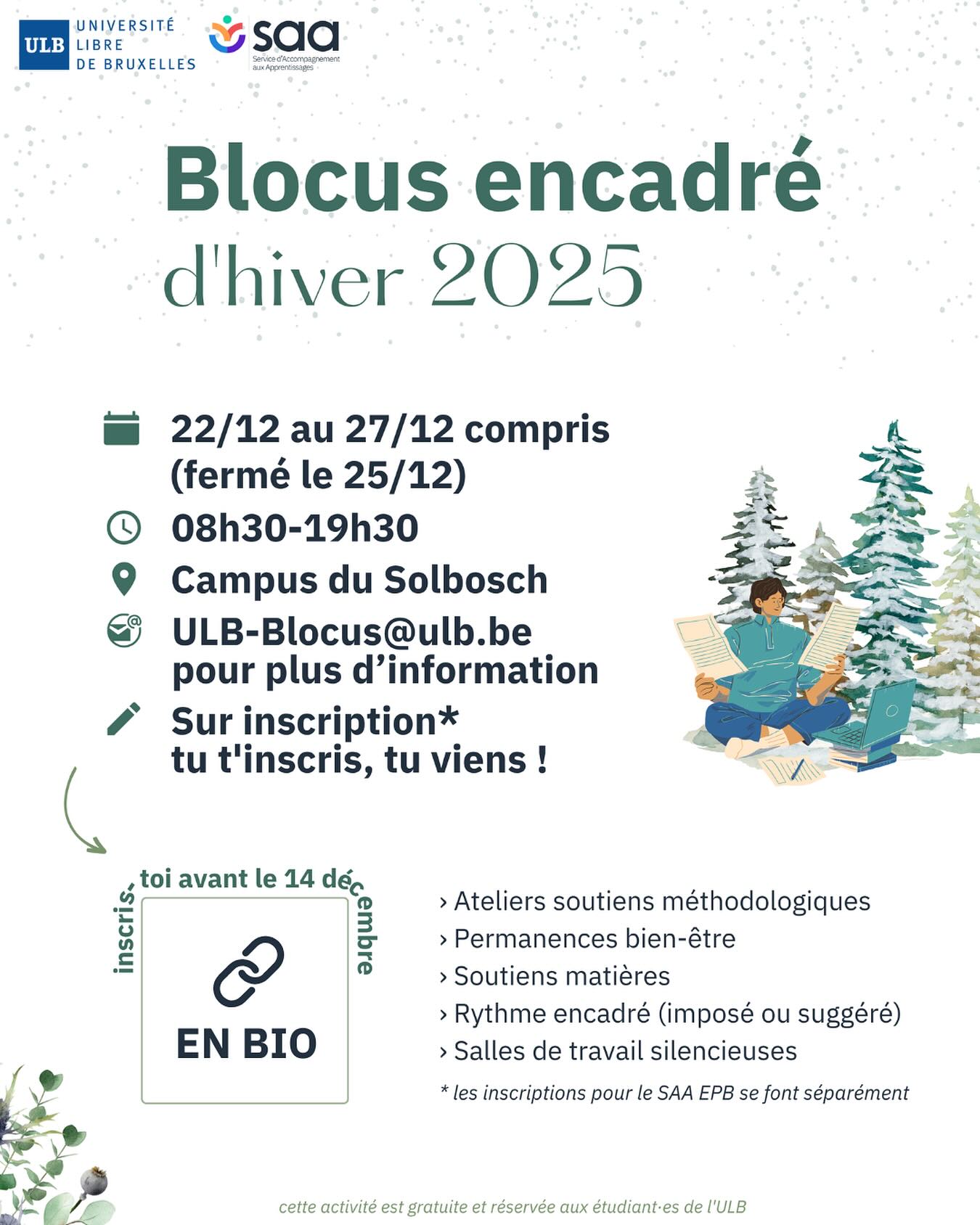 Le Service d'accompagnement aux apprentissages (SAA) , service d'aide à la réussite, vous propose de participer à son blocus assisté d'hiver, de printemps ou d'été !