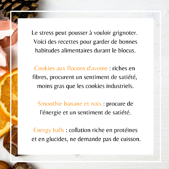 Le stress peut pousser à vouloir grignoter. Nous savons également que l'alimentation influence la digestion, le sommeil et la concentration ce qui peut perturber votre étude durant le blocus.