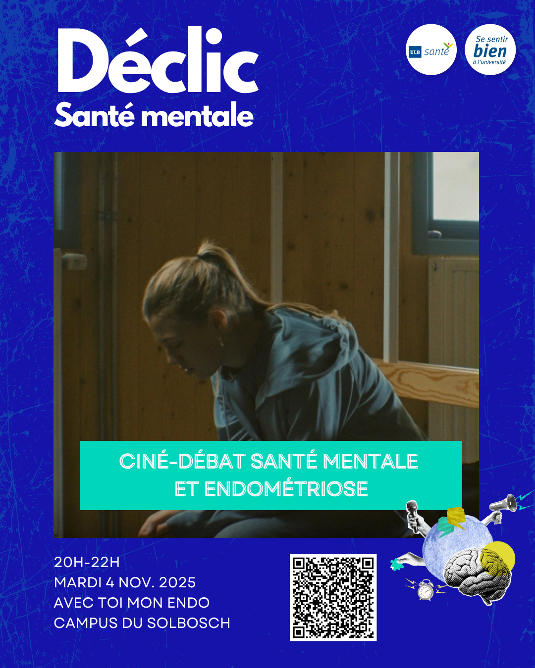 Dans le cadre de la campagne Déclic Santé Mentale d'ULB Santé, nous vous invitons le mardi 04 novembre 2025 de 20h à 22h à un ciné-débat sur l'endométriose et la santé mentale : "Derrière le sourire", un documentaire de 30 min de l'asbl Toi Mon Endo. Suite à la projection du documentaire, nous vous proposons de rester discuter avec l'asbl Toi Mon Endo.