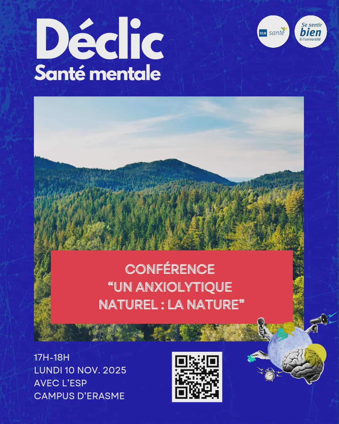 Dans le cadre de la campagne Déclic Santé Mentale, ULB Santé vous invite le lundi 10 novembre de 17h à 18h à la conférence "Un anxiolytique naturel : la nature ".